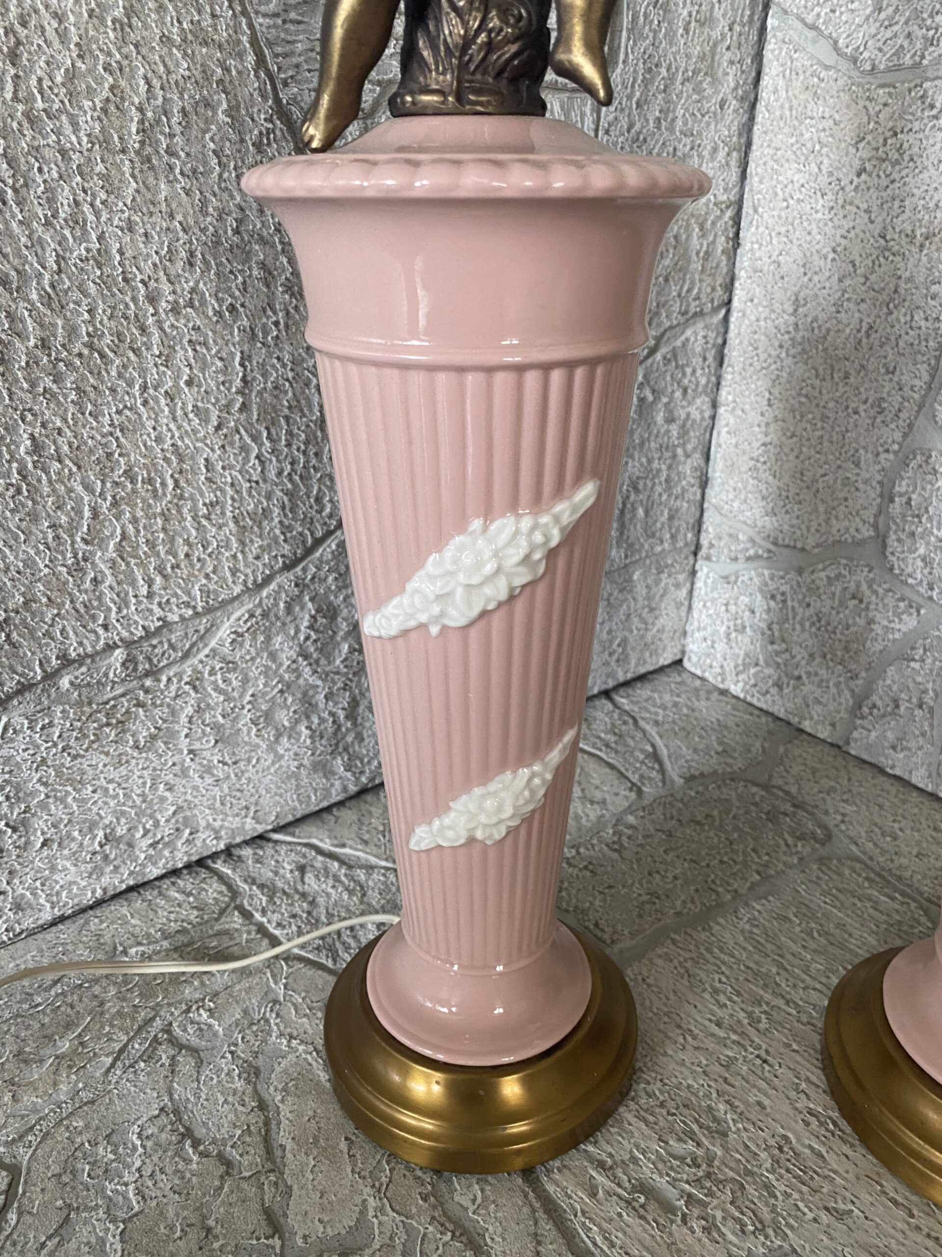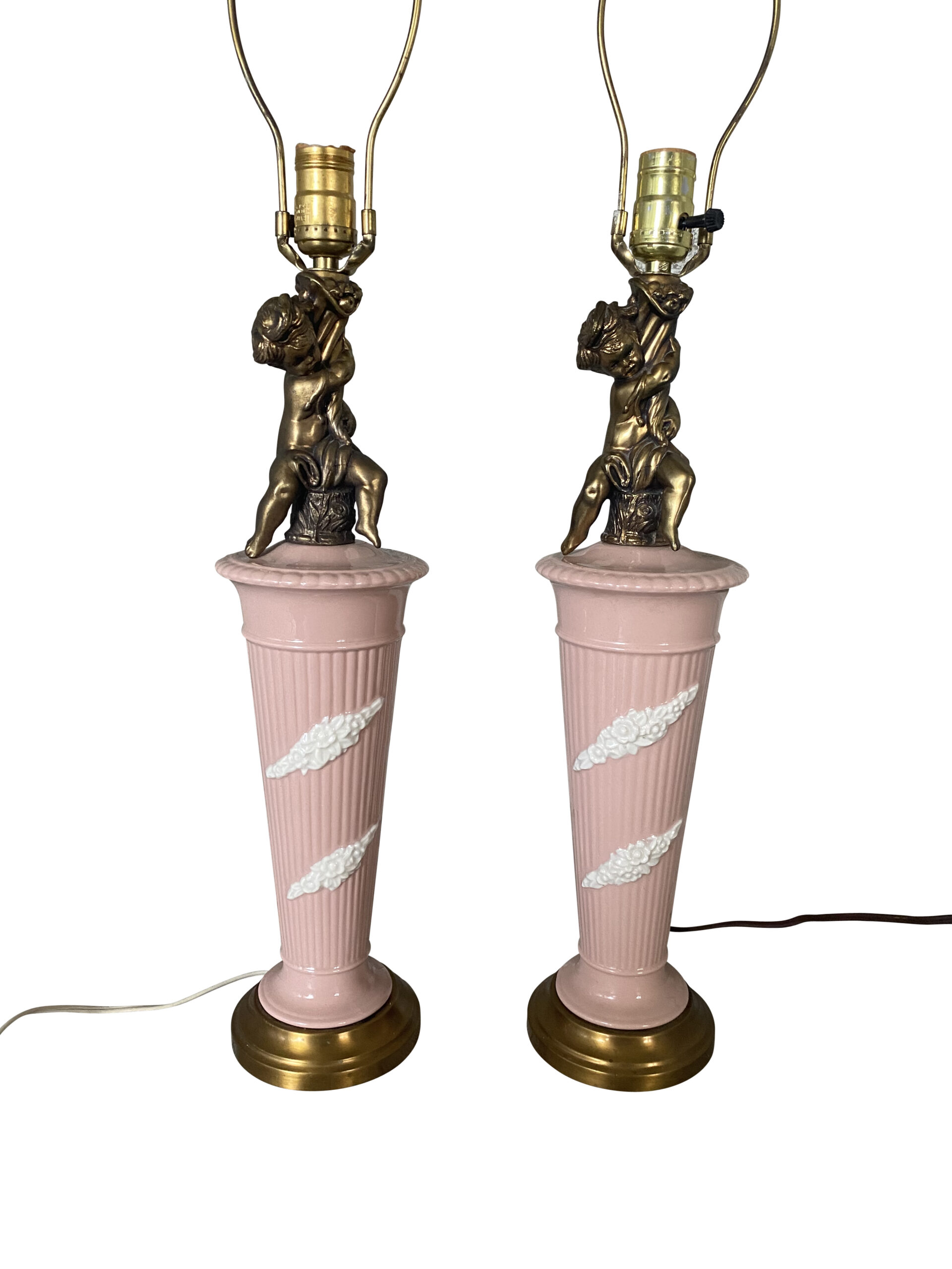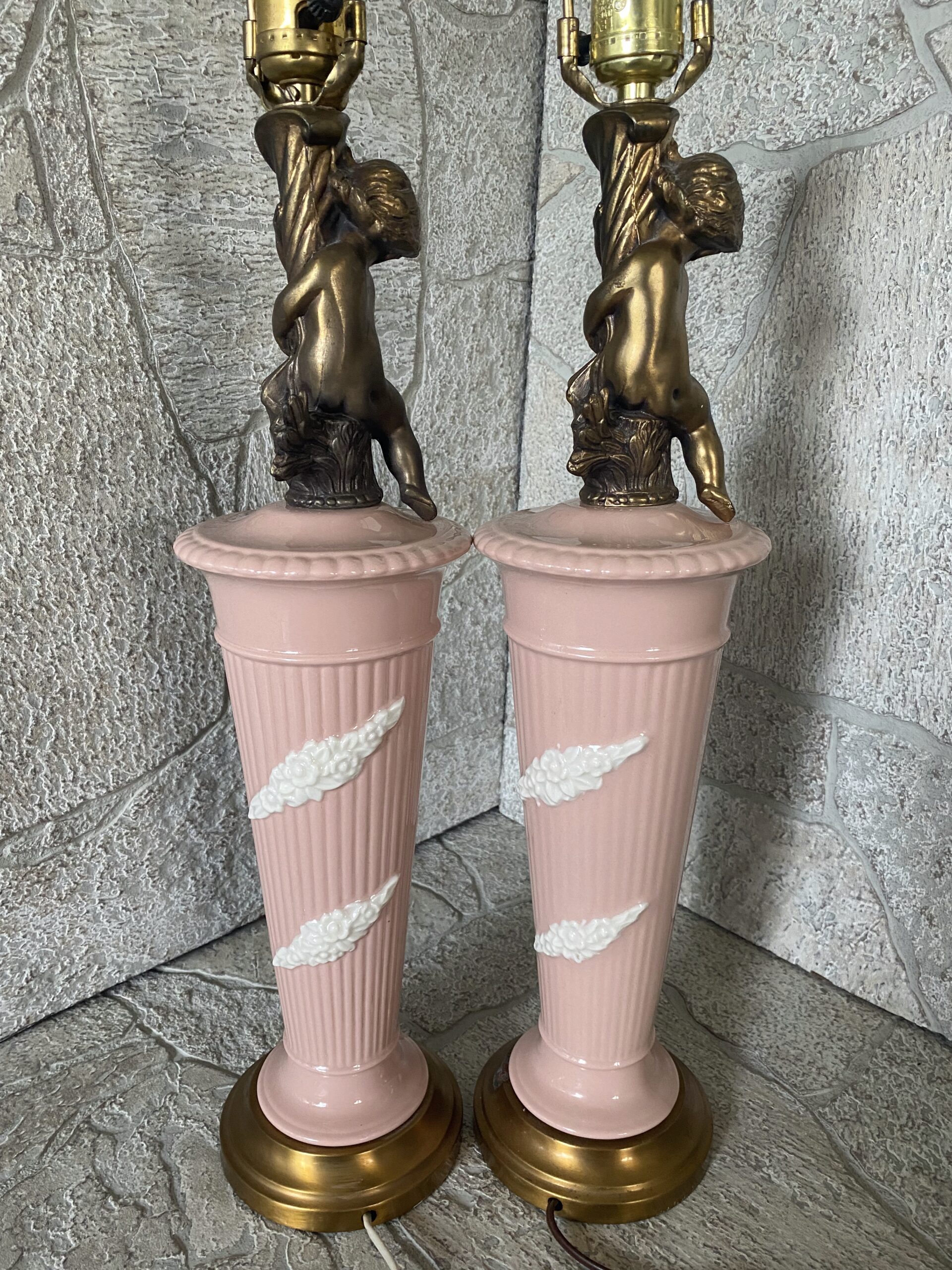 Pink Porcelain Ceramic Cherub Lamp Pair / Hollywood Regency Pink Ceramic